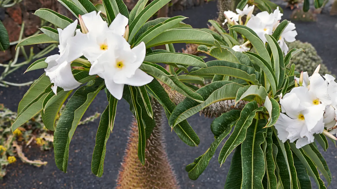 A palmeira de Madagascar (Pachypodium lamerei) é uma planta que intriga e encanta, despertando a curiosidade de jardineiros e entusiastas da natureza em todo o mundo. Apesar do nome, ela não pertence à família das palmeiras, mas sim à família Apocynaceae, a mesma das rosas do deserto. Originária da ilha de Madagascar, essa suculenta exótica se destaca por sua aparência peculiar, com um tronco espinhoso e folhas que se assemelham às de uma palmeira.